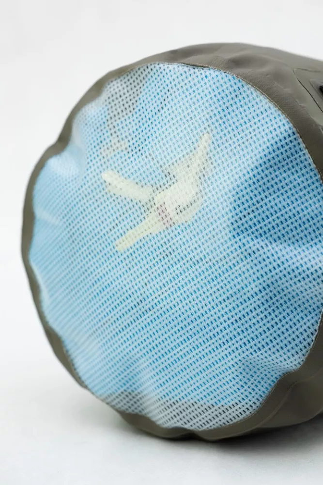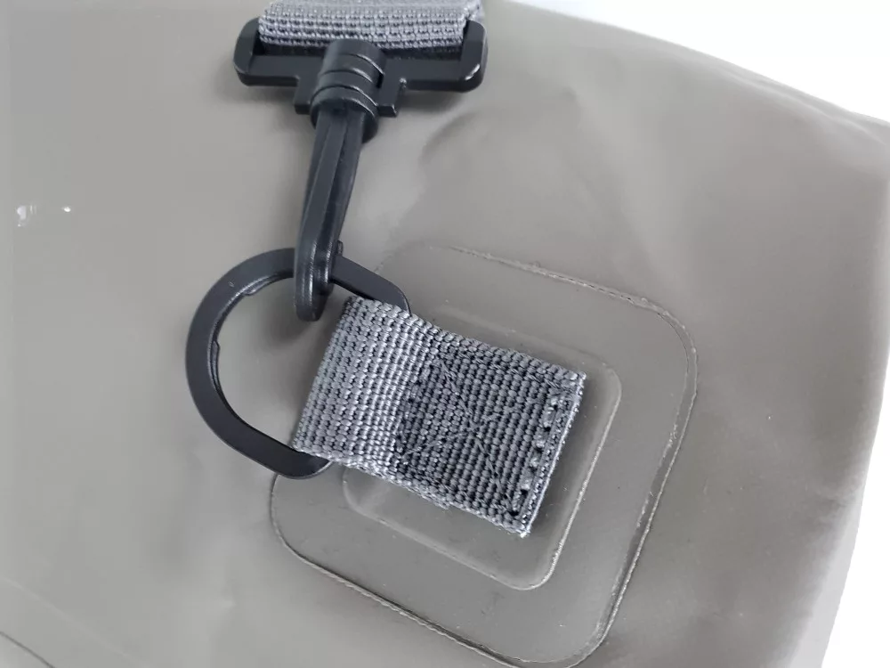 Za najboljše zapiranje zavij zgornji del trikrat in zapni sponko. Če v notranjosti pustiš nekaj zraka, vreča bo plavala na vodi – kar poveča vidnost in varnost tvoje opreme.